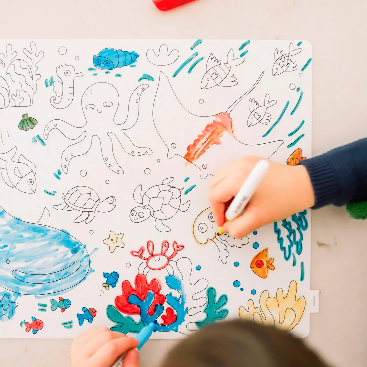 Die wiederverwendbare Silikonmatte mit den „non-permanent-Farbstiften" eröffnen dir eine Welt voller kreativer Möglichkeiten: Malen, wegwischen, neu anfangen – so oft du willst. Die Rückseite ist ohne Motive für freies Zeichnen und Ausmalen.