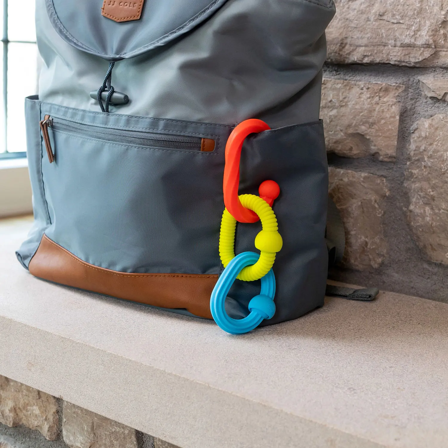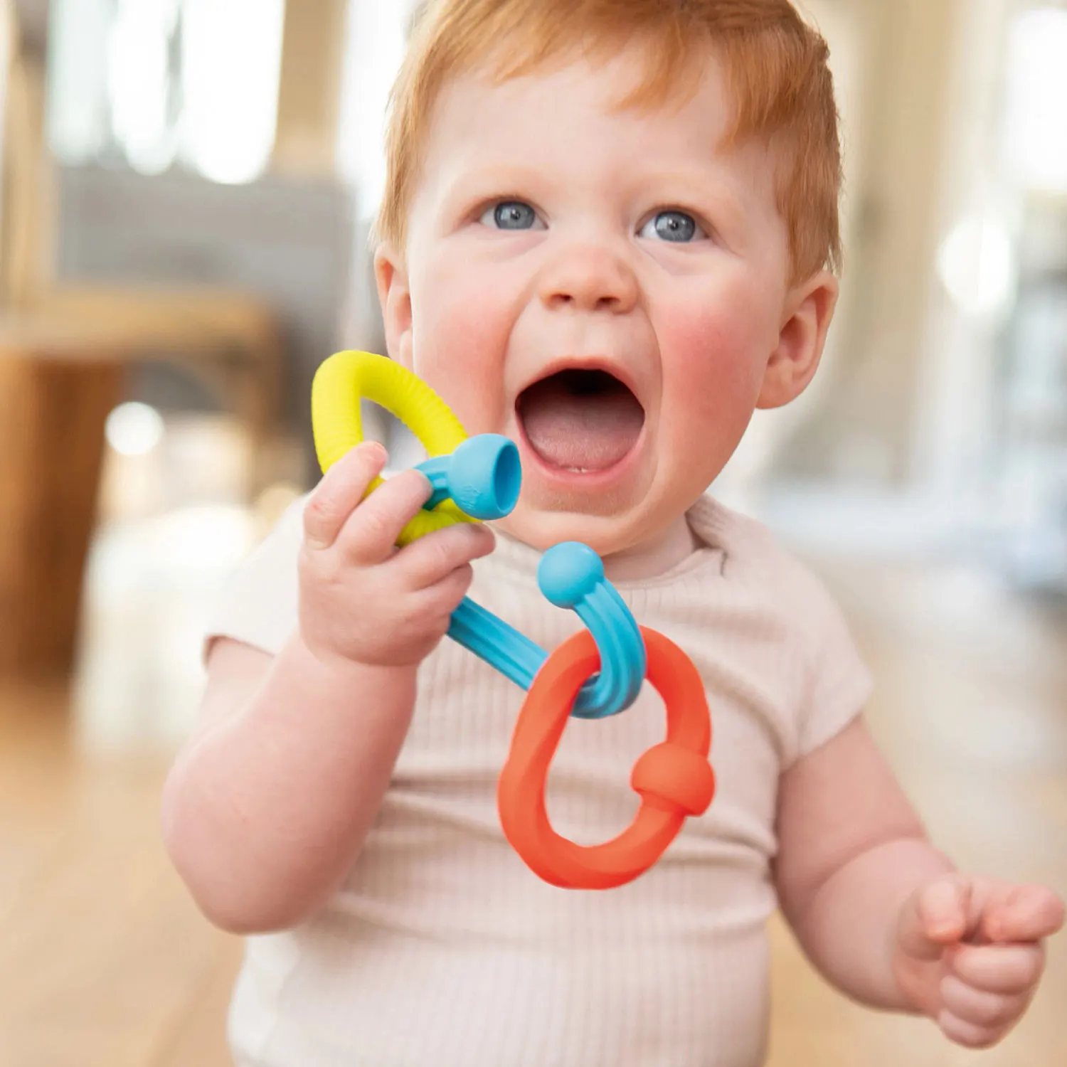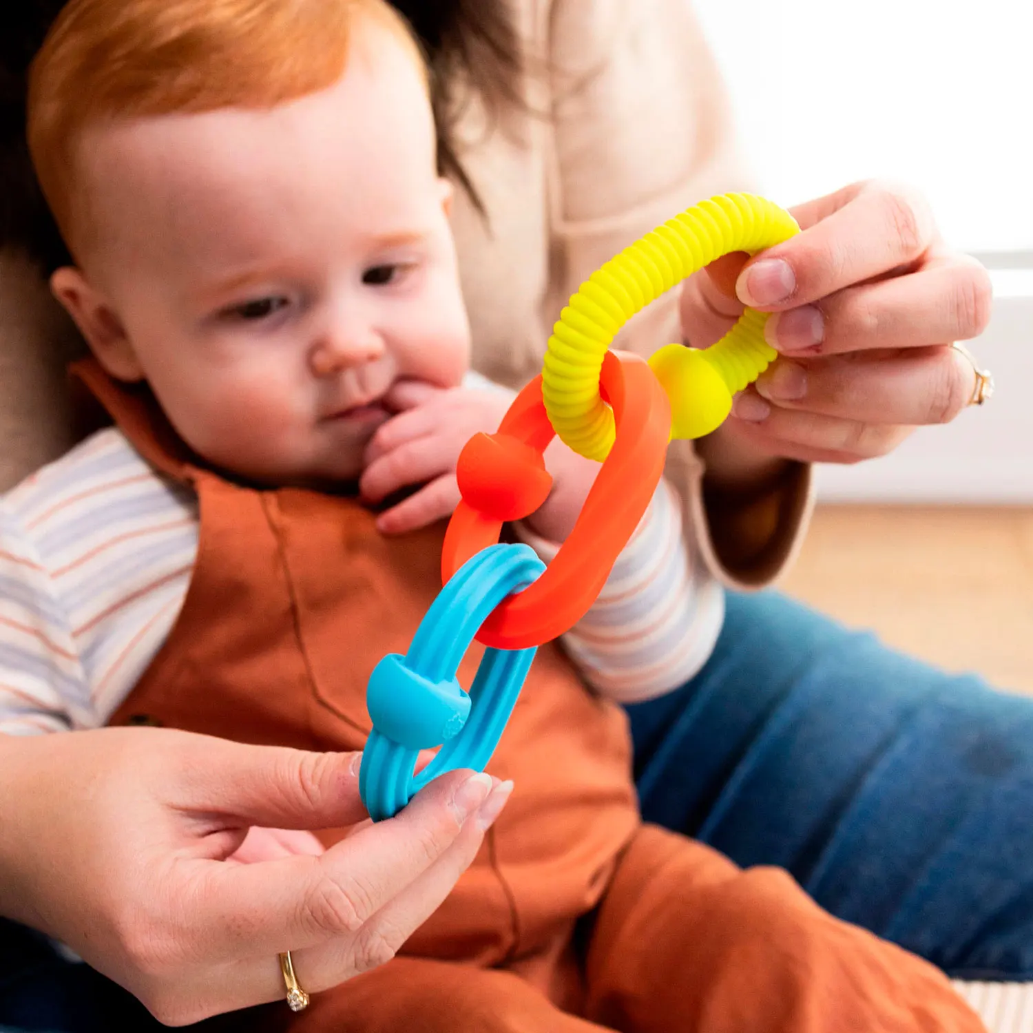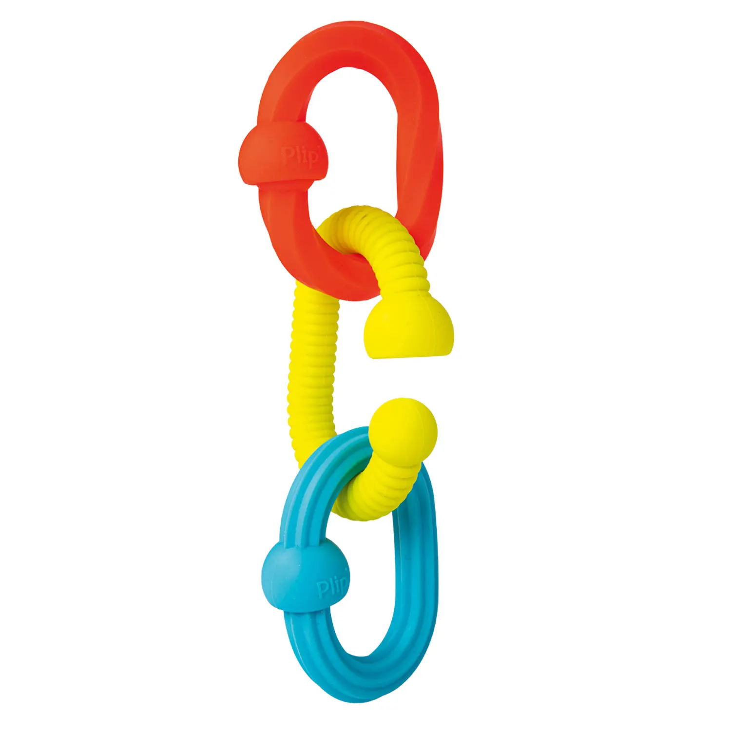 Greifen, ziehen, plop! Die drei Silikonglieder sind perfekt für kleine Hände, bieten spannende Texturen. Die Steckverbindugen lassen sich mit einem befriedigenden Geräusch verbinden und trennen. Fördert sensorisches Lernen und Feinmotorik.