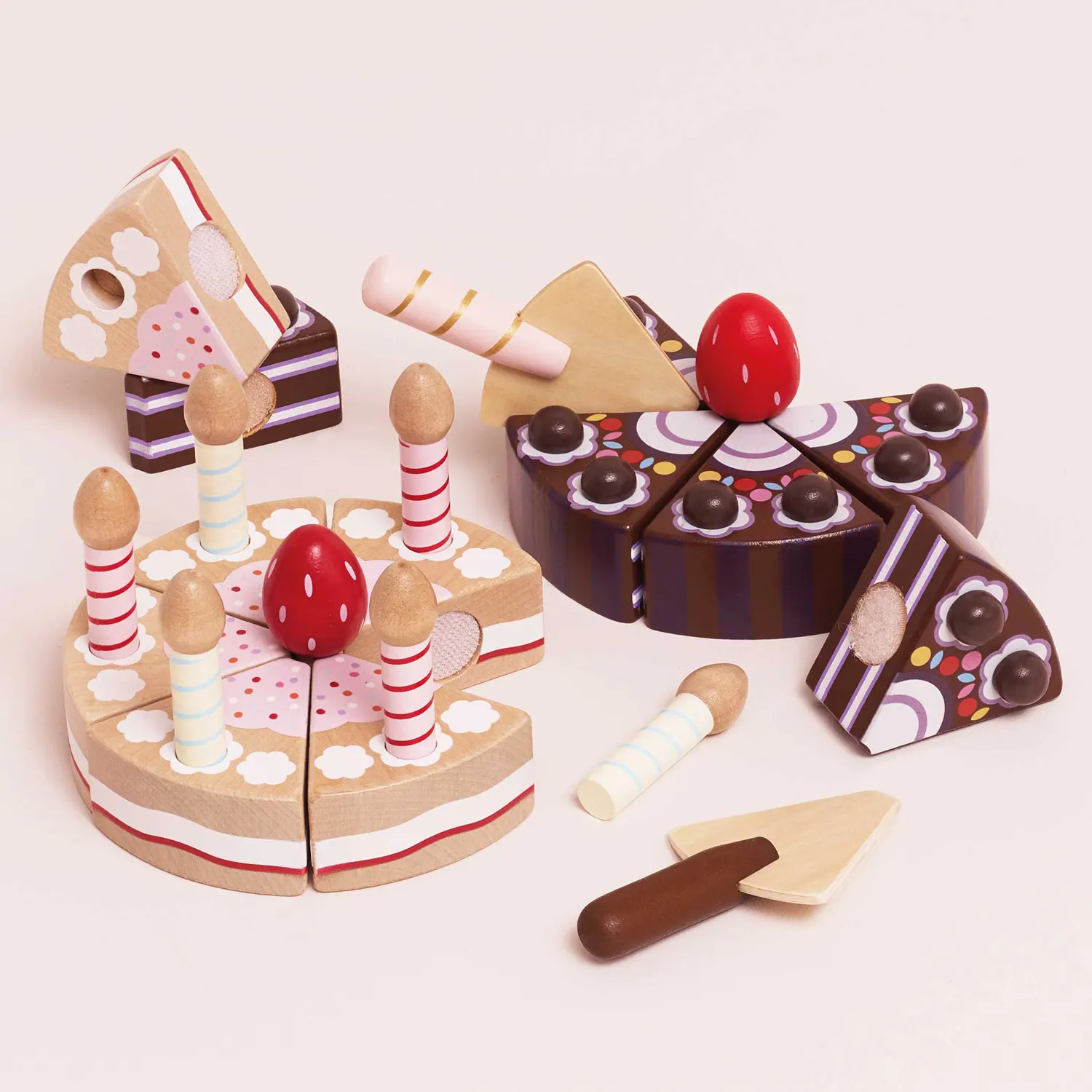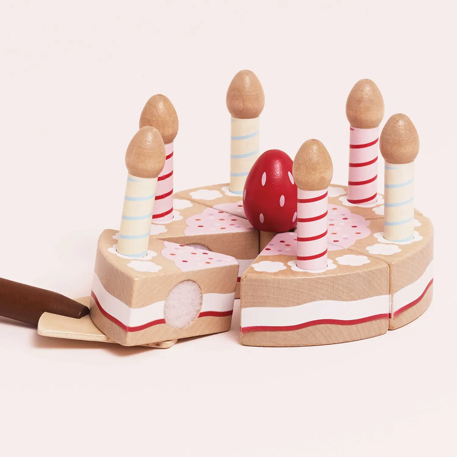 Designed with thoughtful details, the cake features a removable strawberry topper and five removable candles. Each slice is joined with Velcro, allowing little hands to "cut" and serve just like the real thing. It even includes a wooden cake slice to make every birthday celebration feel complete.